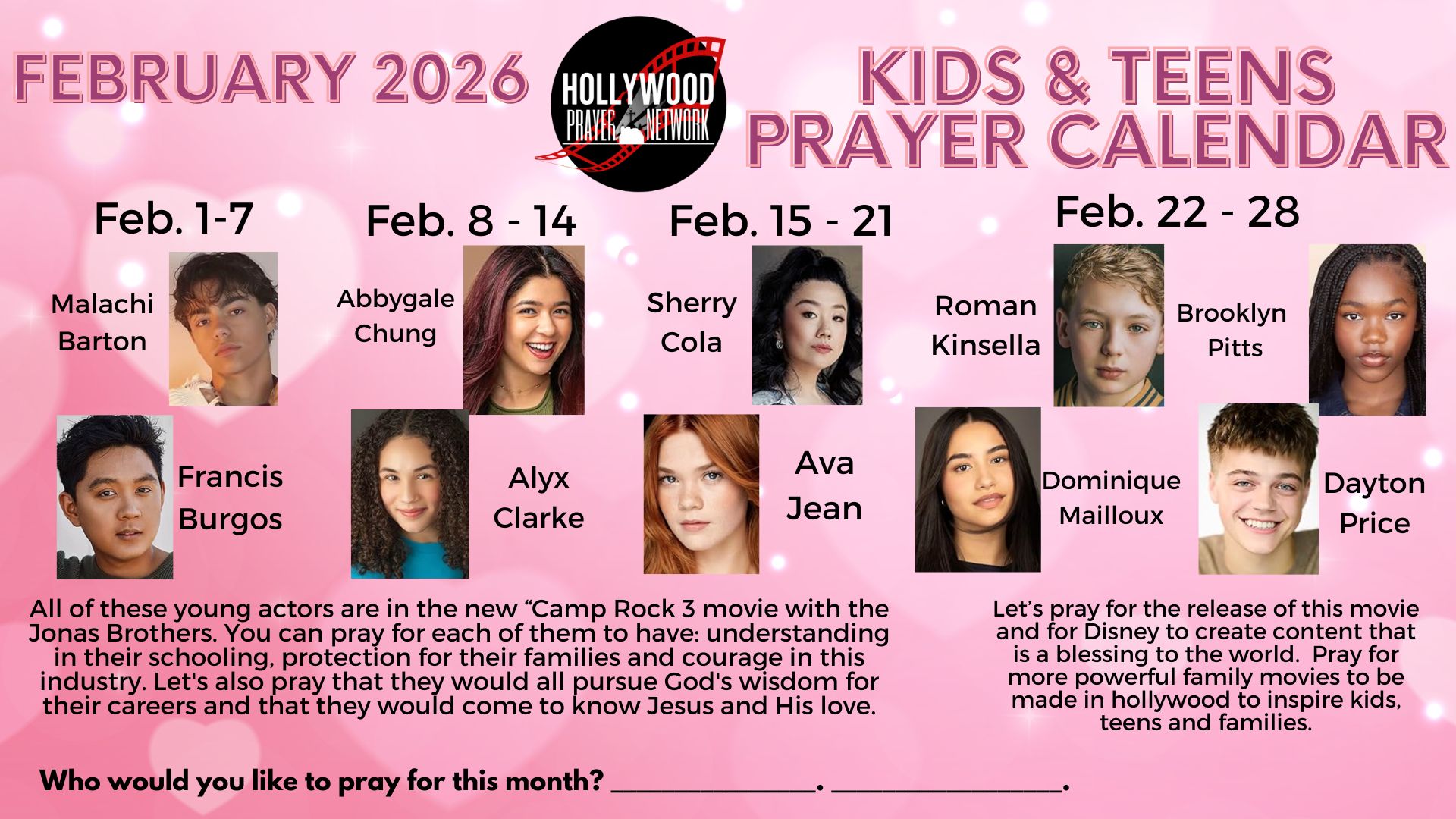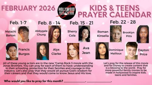 We are excited to include young people, youth pastors and families in our prayers for Hollywood! Join us in praying for those who influence kids in film, television and music. Download or print the calendar and pass it on to your families, friends, and youth group leaders so that our young people are encouraged to be praying for their peers as they watch and listen to their favorite films, TV shows and songs.